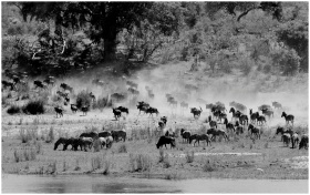 Monochrome image of zebras and wildebeest grazing on a dusty savanna, capturing wildlife in nature.