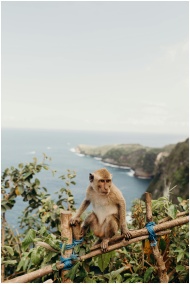 A monkey perched on a fence with a scenic view of Bali's coastline in the background.