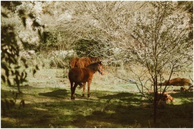 Horses grazing peacefully in a sunlit rural pasture amidst trees and nature.