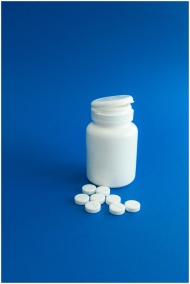 White pill bottle with scattered tablets on blue s
