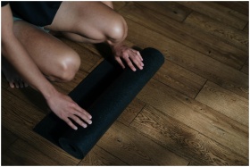 A man preparing for a yoga session by unrolling a black mat on wooden flooring in a yoga studio.
