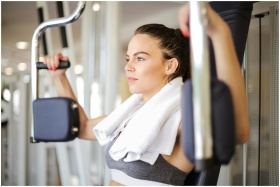 Focused woman exercising at gym, showcasing strength and fitness commitment.