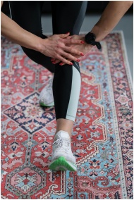 Close-up of a woman's leg stretching on an ornate carpet for fitness routine.
