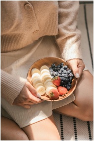 A woman holding a wooden bowl of sliced bananas, blueberries, and strawberries in natural light.