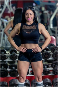 Strong and confident woman posing in a gym with we