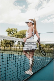 Elegant woman in sportswear leaning on tennis net,