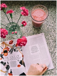 A fresh pink carnation vase, magazine, and smoothie on a speckled countertop.