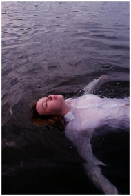 Woman peacefully floating in calm waters, creating a serene and introspective atmosphere.