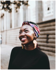 Smiling woman wearing vibrant headscarf and earrings, captured in an urban street setting.