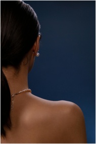 Sophisticated back view of a woman showcasing a delicate necklace against a dark backdrop.