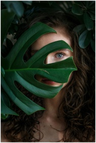 A beautiful woman peeks through lush green leaves