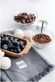 A stylish food display featuring blueberries, chocolate chips, and macarons on a gray cloth.