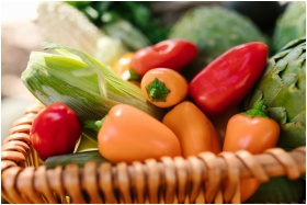 Vibrant collection of fresh organic vegetables including peppers and artichokes in a wicker basket.