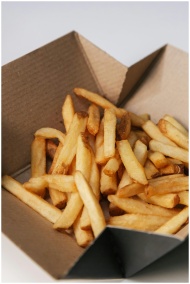 Close-up of golden french fries in a brown cardboa