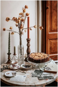 A cozy autumn still life with cake, candles, and postcards on a vintage table.