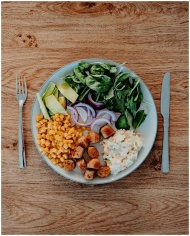 Delicious plate featuring avocado, corn, salad, sausages, and mashed potatoes on a wooden table.
