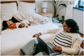 High angle of joyful young ethnic mother smiling while watching movie on netbook sitting near adorable baby sleeping on bed with father during weekend at home