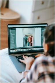 Back view of crop unrecognizable female remote worker retouching photo on netbook while working in house