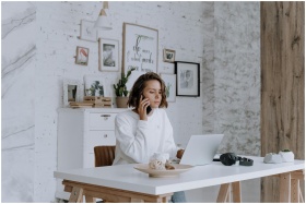 Woman talking on phone while using laptop in bright, modern home office with decor.
