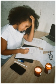 A stressed young woman works from home with candles lit, documents, and devices on the table.