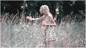 A blonde woman in a floral dress admires flowers in a sunny meadow.