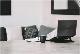 A minimalist home office setup with a laptop and coffee cup in Bali, Indonesia.