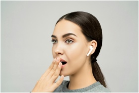 Portrait of a young woman with wireless earbuds, expressing surprise against a gray background.