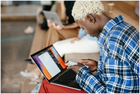 A mother multitasking on a laptop while her two yo