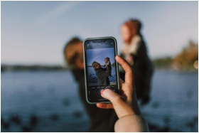 A father lifting his child against a serene outdoor backdrop, capturing the moment on a smartphone.