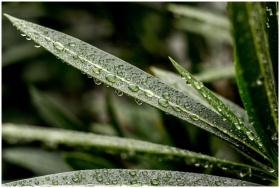 Detailed close-up of lush green leaves with dew, showcasing nature's freshness.