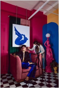 Colorful portrait of an adult being styled by a makeup artist in a creative studio setting.
