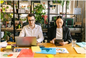 Two professionals working with laptops and tablets