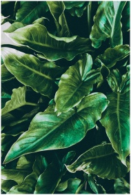 Close-up of lush green tropical leaves, offering a