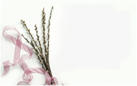 Photograph of pussy willow branches tied with a pink ribbon on a white background.