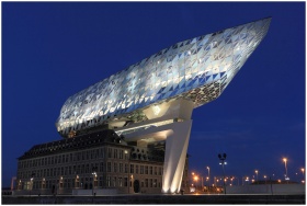 Illuminated Havenhuis in Antwerp, Belgium, showcasing modern architecture at dusk.