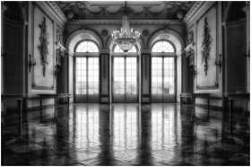 Black and white photo of a baroque interior with a chandelier and large windows.