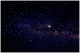 A serene view of a crescent moon nestled in a star-filled night sky with the Milky Way.