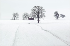 A tranquil snowy landscape with frosty trees and a wooden cabin in winter.