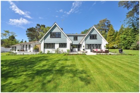 Modern family home exterior showcasing a large lawn and garden under a clear blue sky.