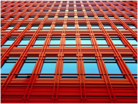Low angle shot of a modern red building with glass windows reflecting the sky.