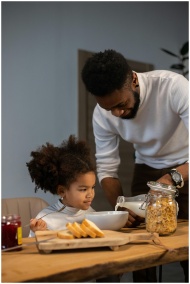 Happy young African American father pouring milk into bowl for daughter for eating cornflakes while having breakfast together at home