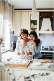 A heartwarming scene of a mother and daughter bonding while baking in their kitchen.