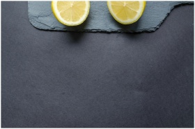 Close-up of fresh lemon halves on slate with a dark textured background.