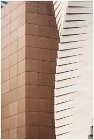 Close-up of contemporary urban building facade with contrasting textures and geometric shapes.