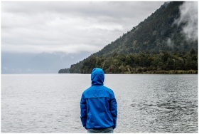 A person in a blue jacket stands by a misty New Ze