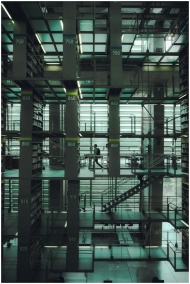 Vertical shot capturing the modern interior of a library in Mexico City.