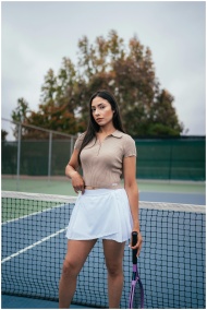 Portrait of a woman standing confidently on a tennis court, showcasing tennis fashion.