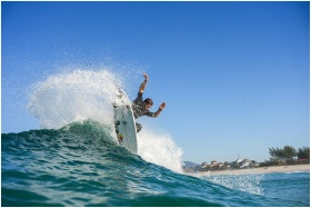Dynamic shot of a surfer executing a maneuver on a wave at Saquarema Beach, Brazil.