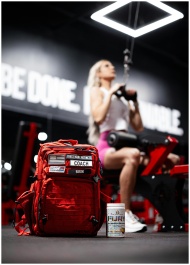 Focused woman lifting weights with a red backpack