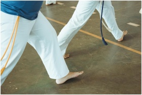 A dynamic martial arts practice session showcasing active movement and traditional attire.
